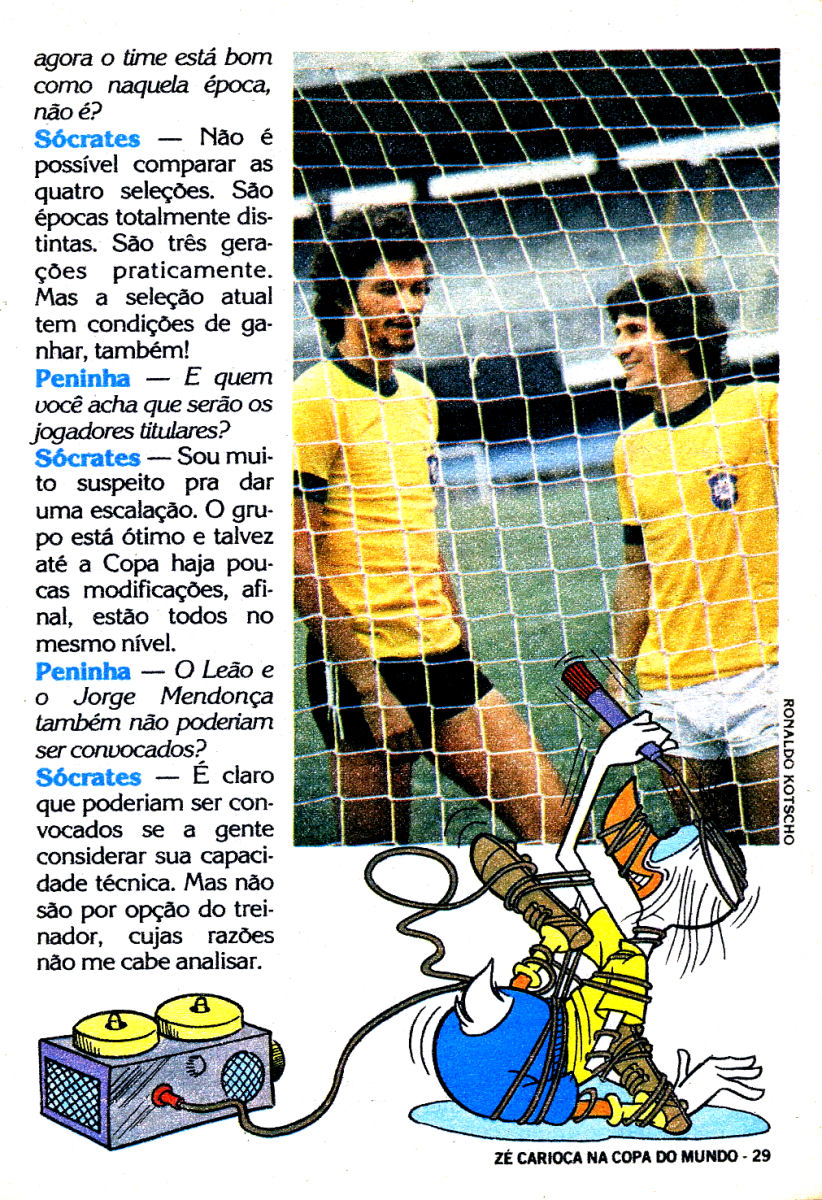 De 82 recordo-me de uma entrevista (a entrevista era a sério) ao Peninha (!), numa revista Disney brasileira especial dedicada ao Mundial (que retratava o Zico como primo afastado do Zé Carioca...), onde afirmava esperar que os portugueses apoiassem o Brasil e... que o Zico era melhor que o Maradona (em 1982). Sócrates, que celebrava os golos de punho fechado erguido, como recorda o Tiago Mota Saraiva. O "verdadeiro Sócrates de esquerda", como lhe chama o Pedro Fragoso, que escreve uma evocação que também recomendo. Ficam algumas páginas da entrevista com o Peninha, e uma grande saudade.